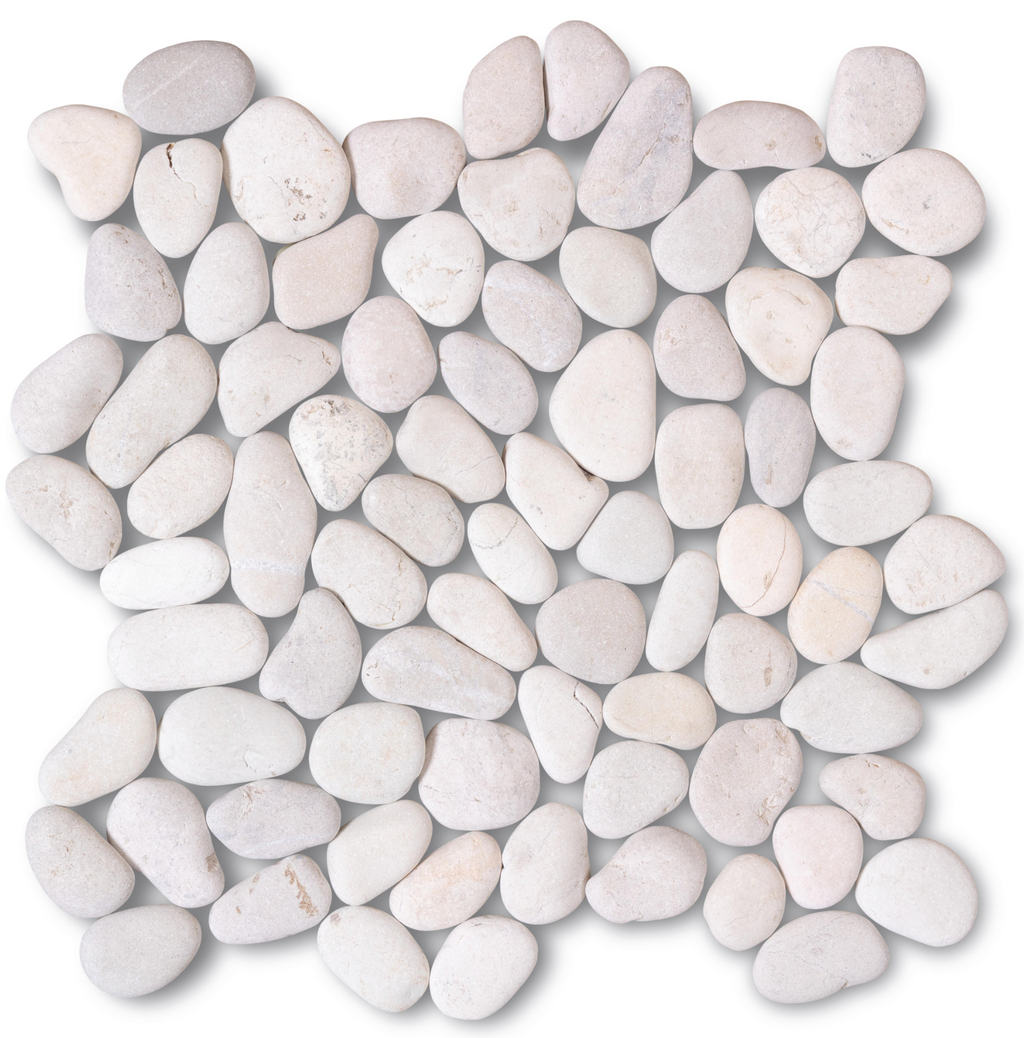 The natural stone mosaic “Galet Blanco” in 30 × 30 cm format consists of hand-selected white round pebbles on a mesh backing. It is ideal for bathrooms, showers, wellness areas, and decorative wall surfaces in both indoor and protected outdoor areas. The natural surface provides a warm, Mediterranean look.