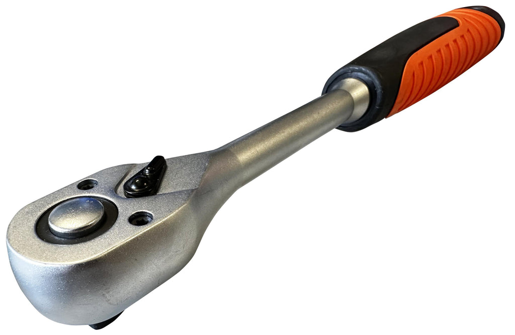 Professional 1-2 Ratchet Wrench is engineered for high-torque fastening and loosening of medium to large fasteners in automotive, mechanical, and industrial maintenance applications. 1-2 Ratchet Wrench is forged from premium chrome-vanadium steel with a polished chrome finish for exceptional strength, durability, and corrosion resistance. The 72-tooth precision mechanism delivers a smooth 5° swing arc for efficient operation in restricted spaces, complemented by a quick-release drive and reversible thumb switch for seamless socket changes and direction reversal. Ergonomic handle design ensures comfort during prolonged use. Ready for shipment within 24 hours after payment.