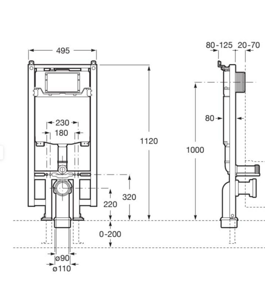 Unterputzgehäuse mit Spülkasten „Roca Duplo One Compact“ , geeignet für Wandmontage. Maße: 495 × 90 × 1120 mm, Rahmen aus Stahl trägt bis zu 400 kg.