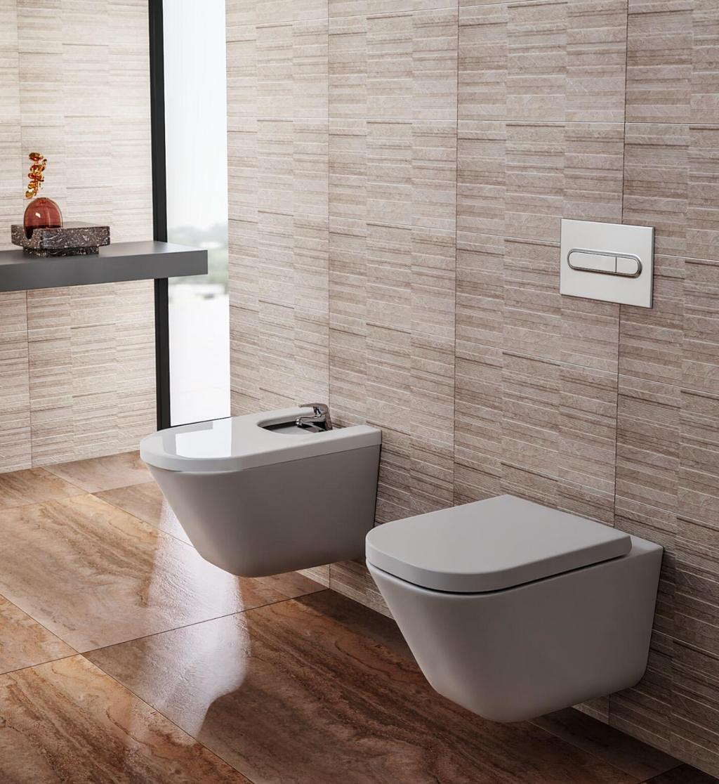 Modell: Gap Hänge-WC • Gap WC-Sitz • Duplo One Compact Unterputzrahmen • Dual-Druckplatte Chrom