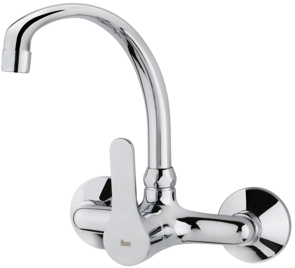 Moderner wandmontierter Einhebel-Küchenmischer aus der TEKA-Serie F0915. In hochwertiger Chrom-Optik mit Messingkern gefertigt, ideal zur Installation über Spülbecken, Arbeitsflächenrückwänden oder in kompakten Küchenbereichen. Der Hebel ermöglicht eine präzise Steuerung von Warm- und Kaltwasser mit nur einem Griff.