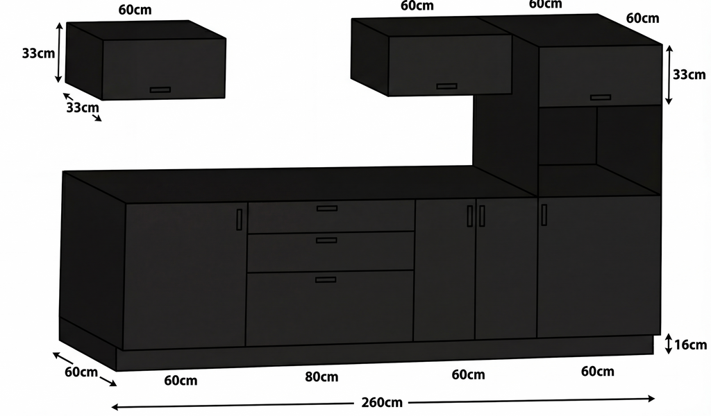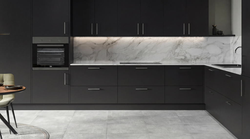 The Berlin Kitchen stands for contemporary, minimalist design and high everyday practicality. Super-matte black fronts with anti-fingerprint properties and metallic handles give an elegant, calm appearance and make the surface particularly easy to maintain. Ideal for anyone seeking a modern, functional space with clean lines.The kitchen can also be customized to larger or smaller sizes. We recommend a measurement by our team so we can provide tailored suggestions based on your floor plans. Booking a measurement is easy by phone or online.