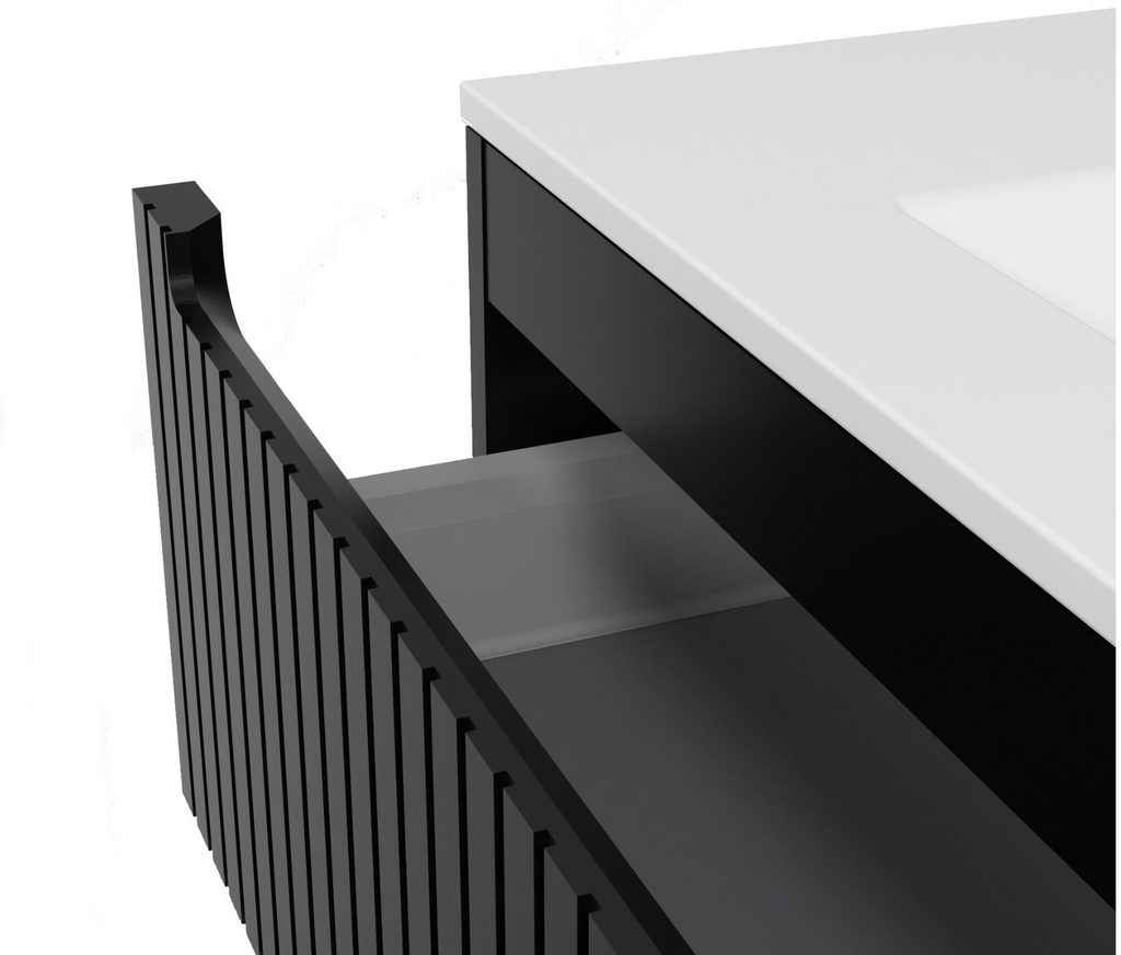 Vanity Cabinet “Blur” in Matte Black – combines minimalist lines with practical functionality. Crafted from high-quality 19 mm melamine surface, the wall-mounted unit offers two soft-close drawers with anthracite-textile fronts – a modern solution for style-conscious bathrooms. Pre-assembled for quick installation. As a wall-mounted unit, it adds spaciousness and lightness to the room.