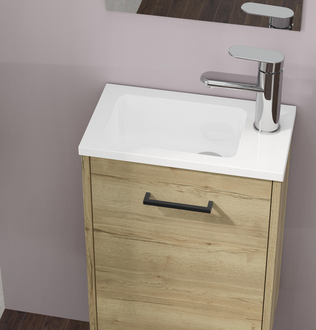 The Maya Roble bathroom furniture set with natural wood look offers compact dimensions 40×22×50 cm and a simple design with one door. Includes a white resin sink and mirror 35×50 cm – ready to install as it is delivered pre-assembled. Ideal for small bathrooms or guest WC. Ready to ship within 24 hours after payment