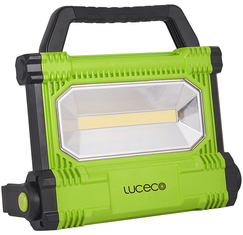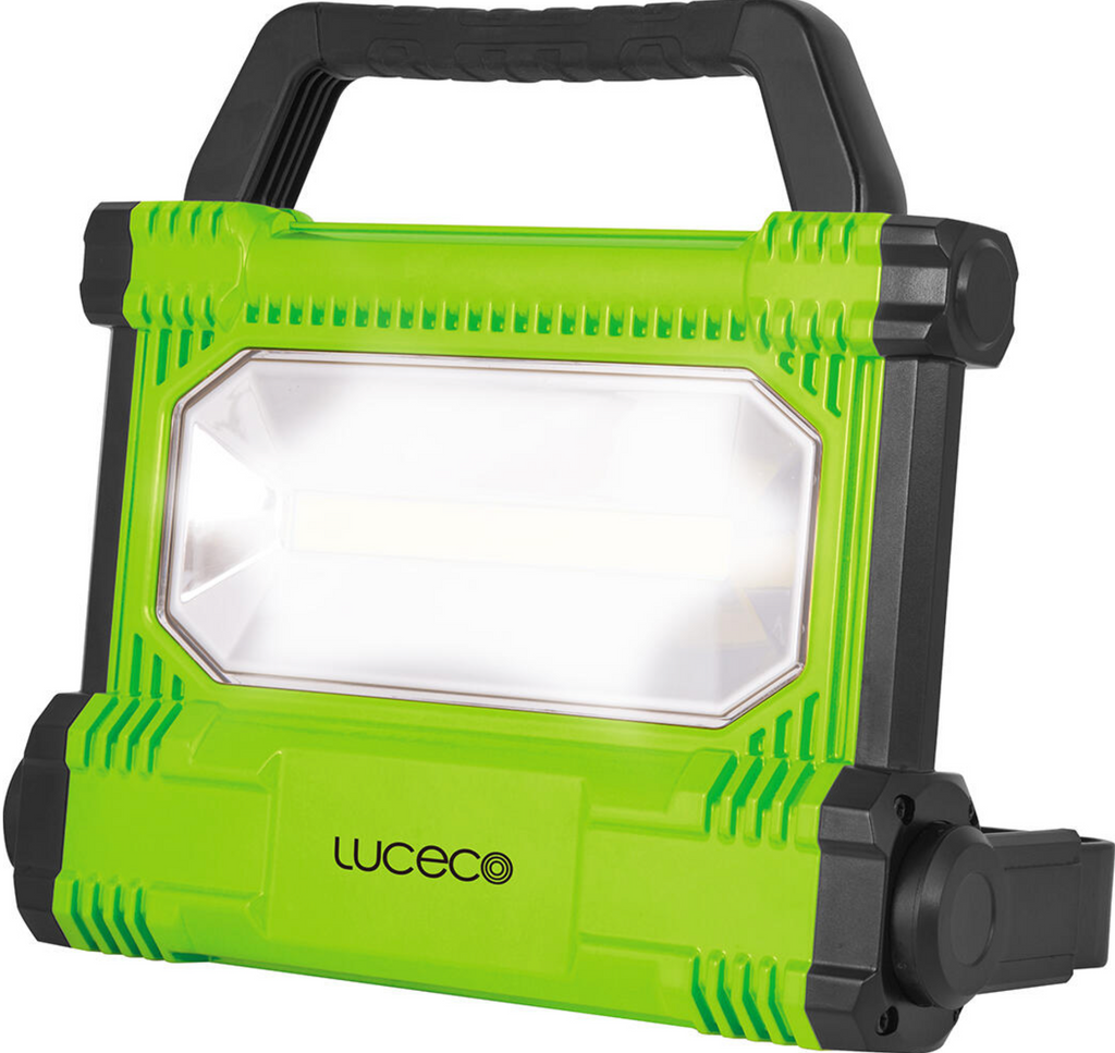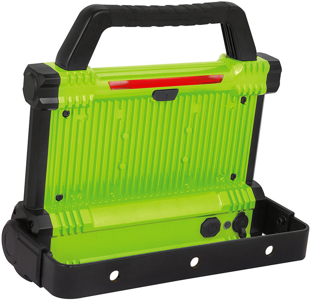 This compact, portable LED work light delivers 30 W of power and bright cool white light (6500 K). Perfect for construction sites, workshops, or outdoor use. It provides 2500 lm brightness with two intensity modes (100 % and 50 %), features a USB-C charging port, and offers IP54 protection. Includes transformer and 12 V car charger.