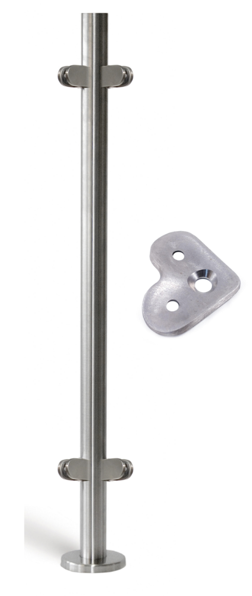 Hochwertiger Eckpfosten aus Edelstahl AISI316 mit satiniertem Finish, speziell entwickelt für die Befestigung von Glasplatten in Geländersystemen. Der Pfosten verfügt über eine stabile Bodenplatte für festen Halt. Ideal für den Einsatz im Außenbereich. Erhältlich in drei Preiskategorien: