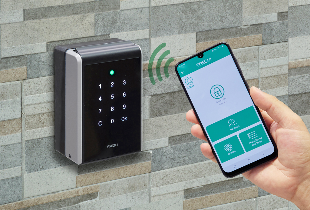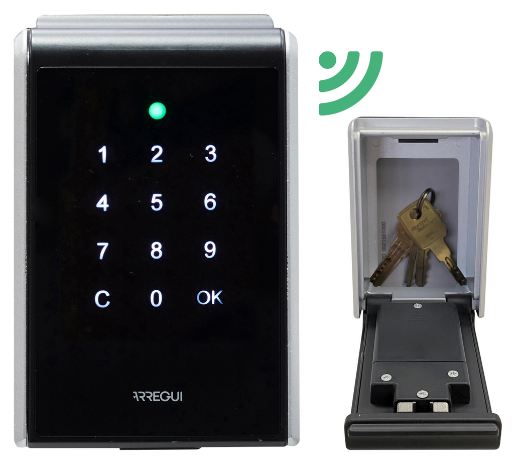 The ARREGUI KEEPER‑E Guardallaves inteligente in silver is a secure, digitally controlled key safe for wall mounting. Unlimited temporary access codes can be assigned via touch code, mobile app, or Bluetooth – ideal for rentals or maintenance access. The robust metal housing with rubber back ensures stability and protection in daily use. Made in Spain, it offers modern security with user management, access logs, and emergency key override.