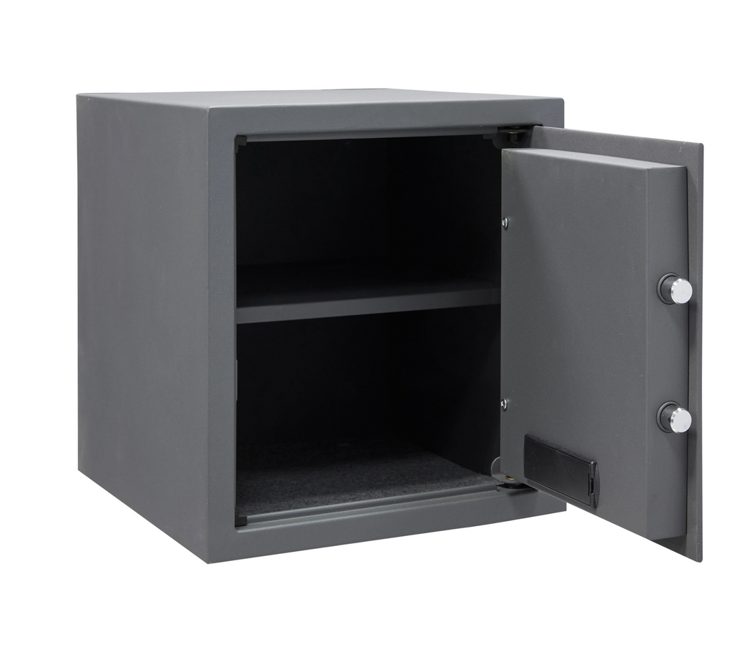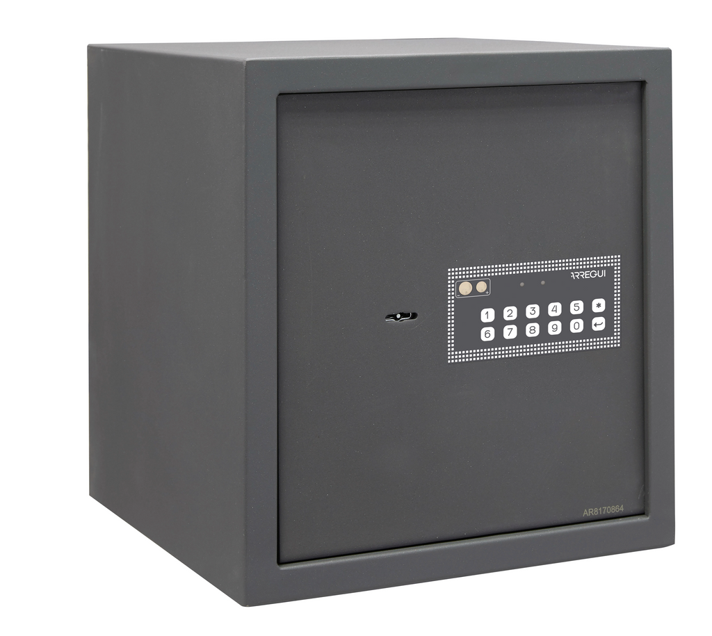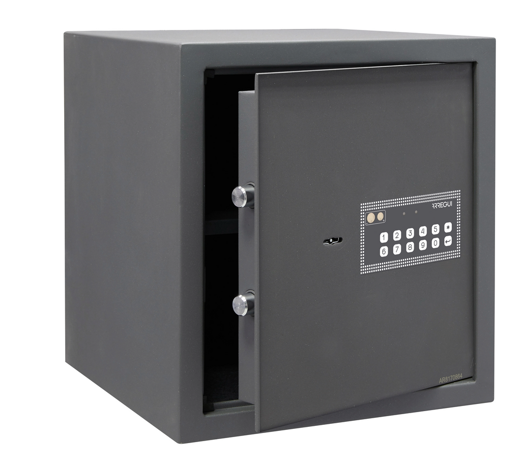 The ARREGUI electronic safe with 39 L capacity provides secure protection for valuables, documents, or electronic devices. Measuring 35 × 50 × 31 cm, this freestanding safe is ideal for both residential and commercial spaces. It features a digital code system with emergency key access, LED display, and interior lighting. The solid steel construction with concealed hinges protects against break-ins. Made in Europe – reliable, sturdy, and easy to use.