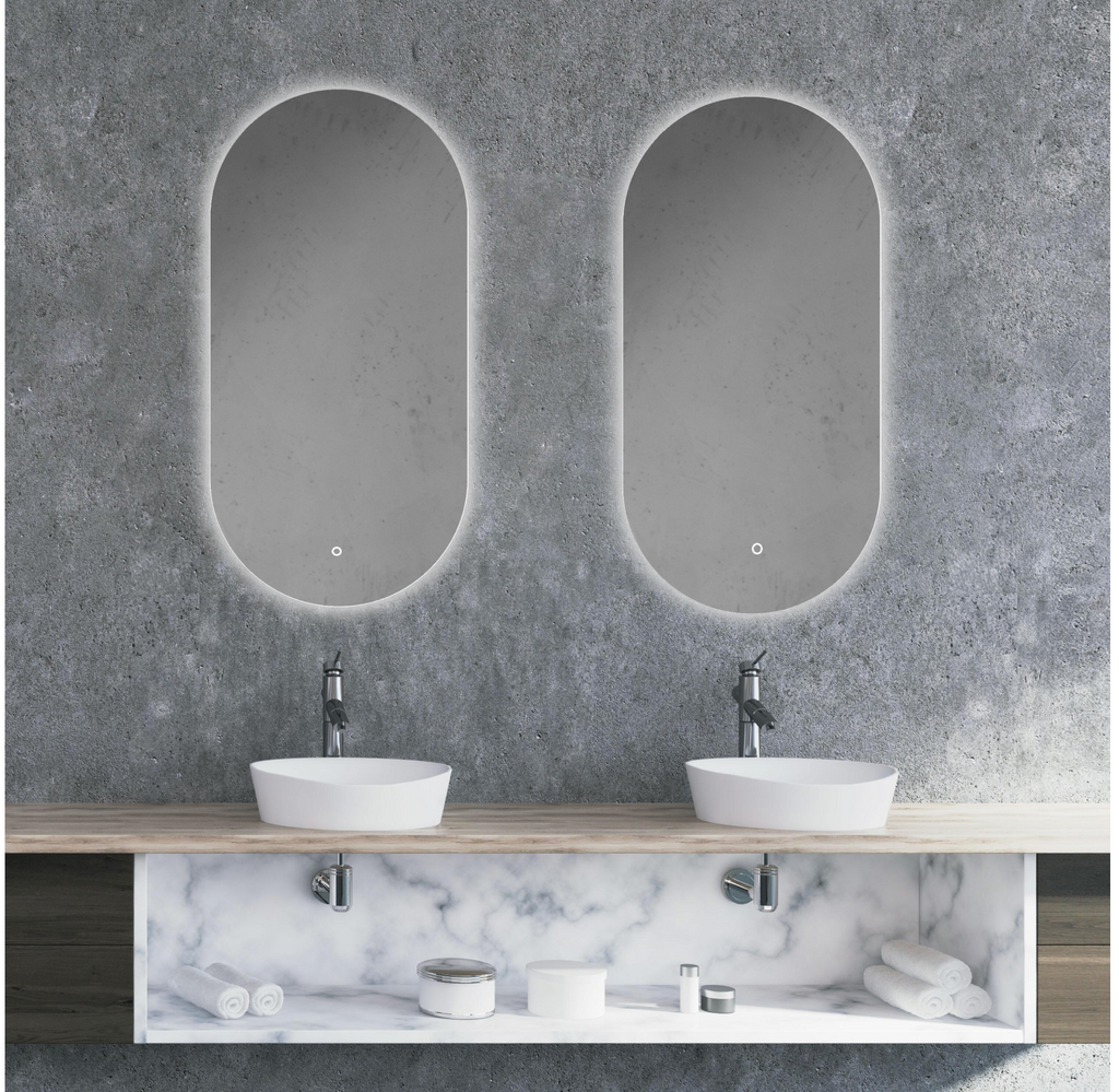 The bathroom mirror with LED light Etna 45 × 90 cm in stainless steel combines functionality with modern design. Its aluminum frame with stainless steel finish and a glass thickness of 3 mm gives it an elegant and durable appearance. The integrated LED lighting provides 20.45 W of power and a brightness of 2045 lumens – ideal for optimal bathroom illumination. A practical touch sensor allows turning the light on and off. With its oval shape and slim design, the mirror is perfect for modern, minimalist bathrooms.
