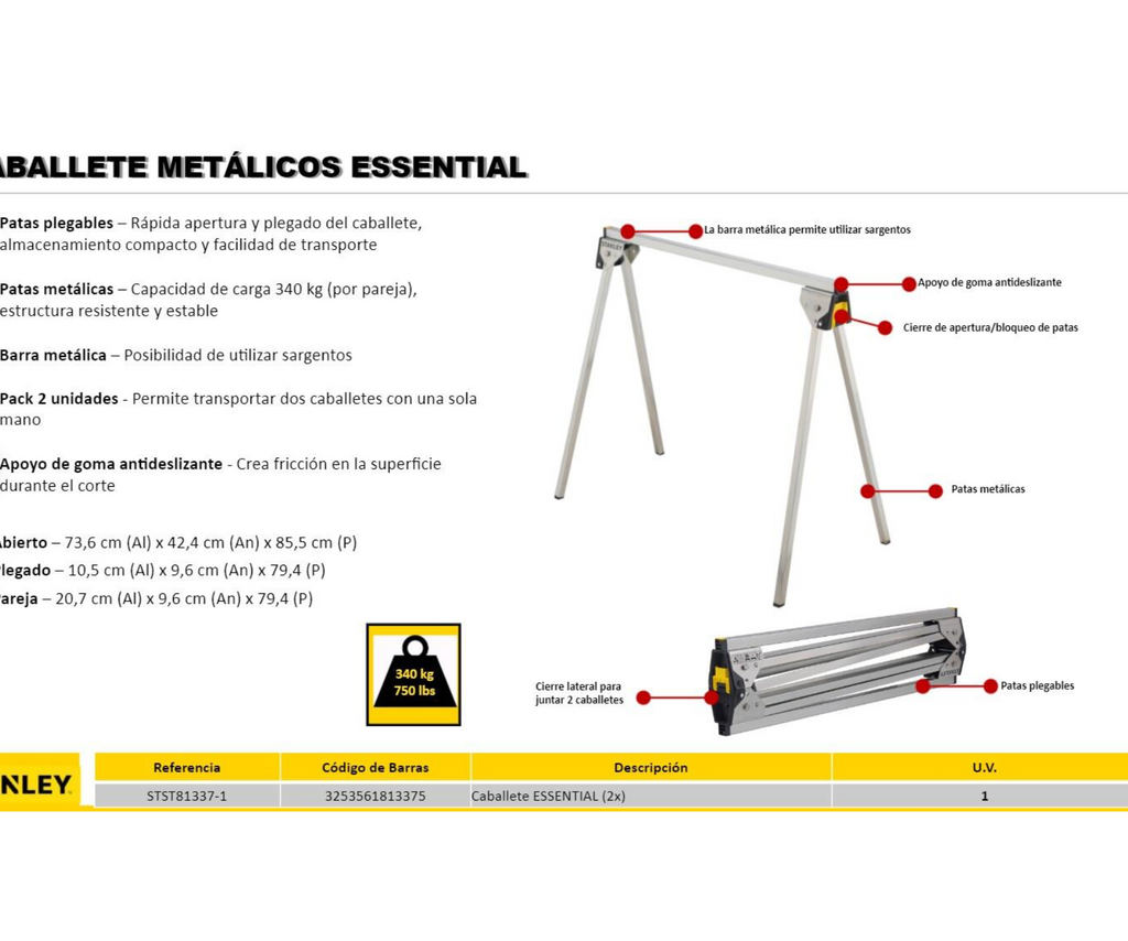 These high-quality folding metal trestles from Stanley come in a pack of two and offer a load capacity of up to 340 kg per pair, making them ideal for workshops, construction sites, or DIY projects. Featuring a sturdy metal structure, non-slip rubber feet, and a metal crossbar for attaching clamps (sargentos), they provide perfect support for cutting, assembly, or as a work aid.