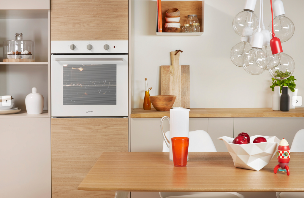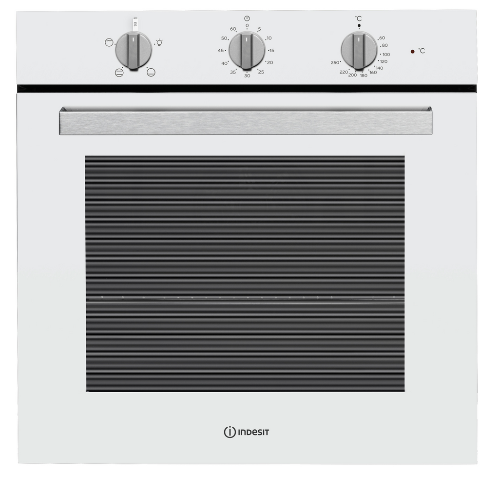 A compact, efficient built-in oven from Indesit in classic white, featuring static heat distribution and an integrated grill function.