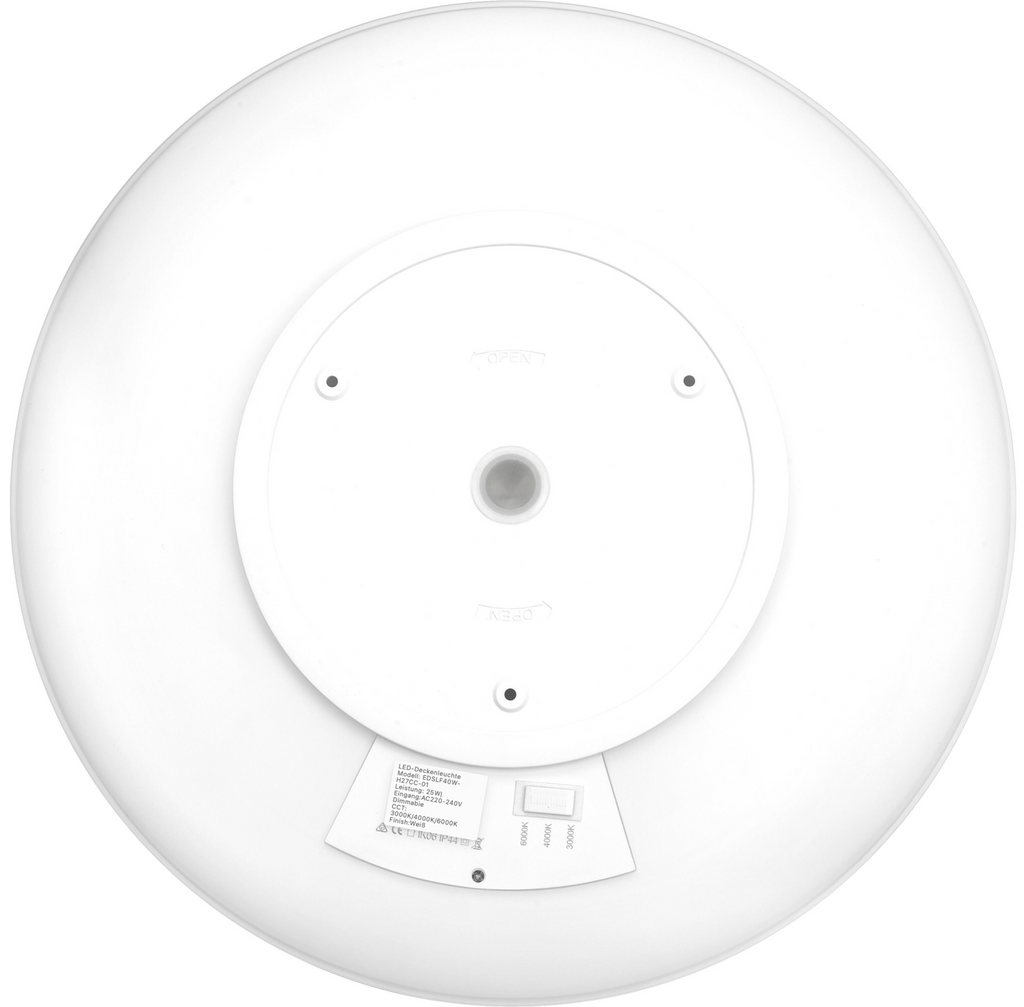 This elegant, round LED ceiling light with a diameter of 40 cm delivers 25 W of power and a brightness of 2700 lm. It allows selection between three color temperatures (3000 K, 4000 K, and 6000 K) directly via an integrated switch. The fixture is ideal for indoor use in bathrooms and kitchens and offers splash protection (IP44).