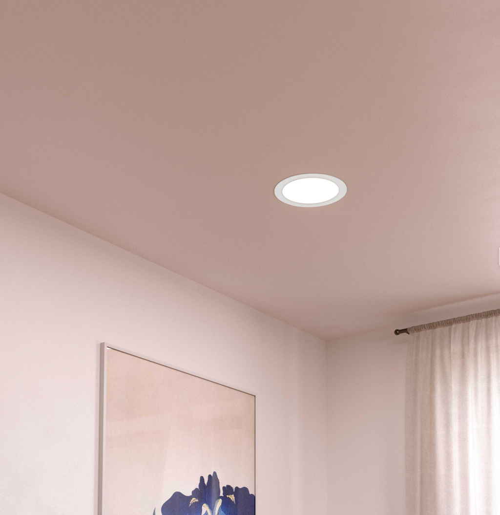 This LED recessed light in white with 12 W power features a CCT system that allows switching between three light colors: warm white (~ 3000 K), neutral white (~ 4000 K), and cool white (~ 6000 K). The highlight: adjustable mounting clips make the fixture compatible with existing ceiling openings from 68 to 150 mm diameter – ideal for renovations where old rings need to be replaced without new cutouts. Luminous flux approx. 1620 lumens, color rendering index (CRI) ~ 80. Frame made of aluminum, diffuser made of polystyrene. Ready to ship within 24 hours after payment.