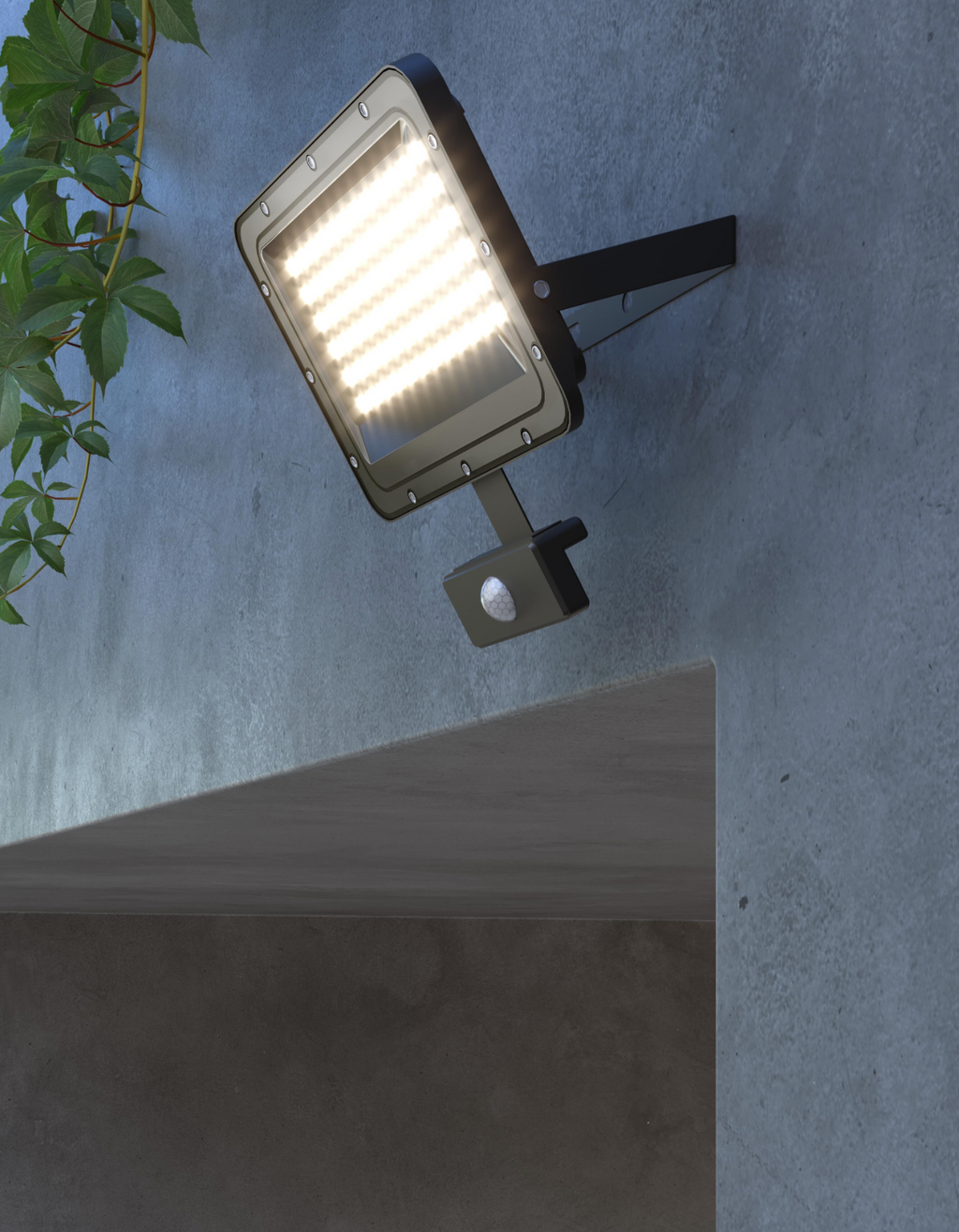 Powerful LED floodlight with 50 W and adjustable color temperature (4000 K to 6500 K) via a switch. Ideal for illuminating gardens, building facades, or industrial buildings. Provides 5,900 lm of light output and has a lifespan of approximately 36,000 hours.