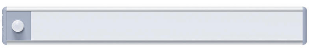 This slim LED strip in gray is wireless and rechargeable, ideal for lighting under shelves, in display cases, or inside cabinets. It provides neutral white light (4000 K), 300 lumens of luminous flux, and a lifespan of approximately 15,000 hours. With a magnetic back for easy attachment and removal during charging. IP20, diffuser made of PVC, and housing made of polycarbonate.