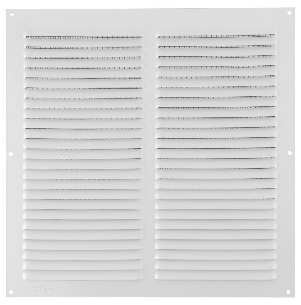Large surface-mounted ventilation grille with integrated insect protection (mosquito net). Made of white painted aluminum with a material thickness of 0.8 mm. Ideal for facades, basements, or large wall openings for ventilation. Ready to ship within 24 hours after payment.