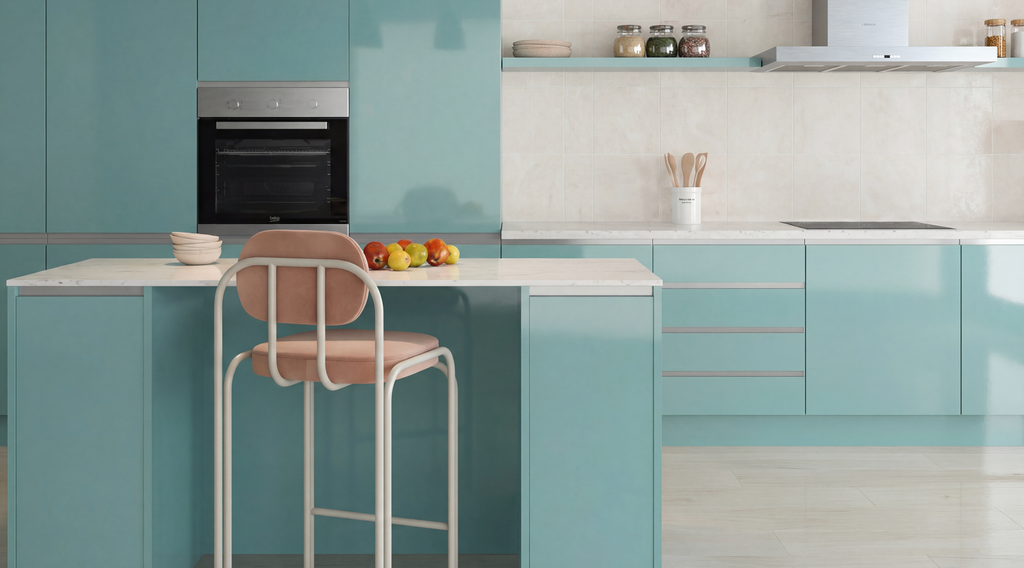 The Lyon kitchen features a modern design with clean lines and a striking Aguamarina color tone. Complemented by elegant silver handle details and a high-gloss PET surface, this kitchen becomes a true eye-catcher for anyone seeking a solution beyond the conventional.