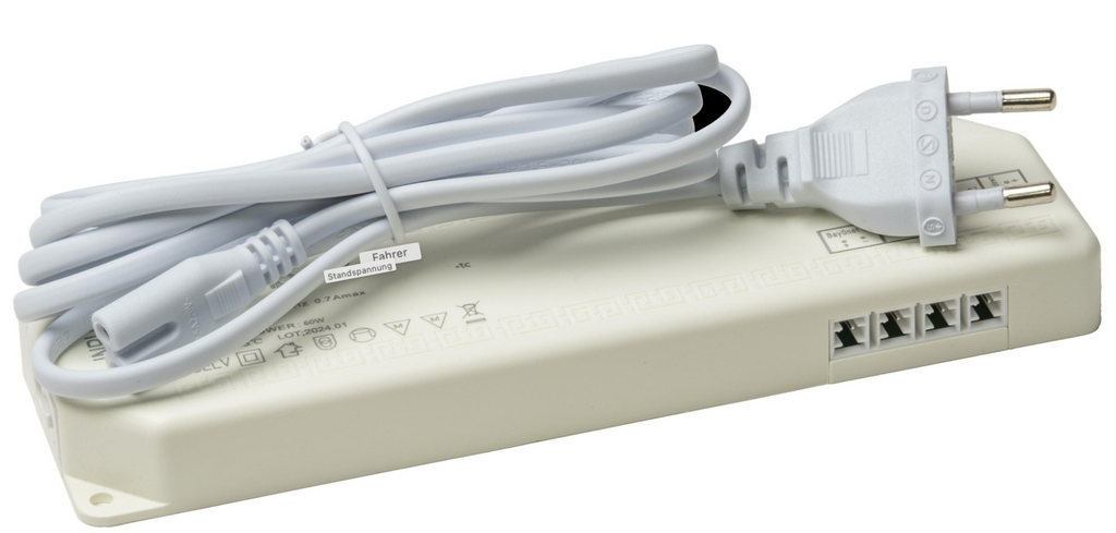Powerful 60 W power supply with 12 V output, specially designed for powering LED profiles or LED strips in furniture and construction applications. Robust construction, ideal for fixed installations in kitchens, shelves, or lighting profiles.