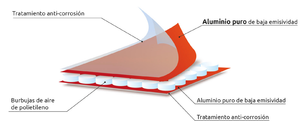 High-quality reflective insulation roll with two layers of coated aluminum and a central polyethylene air bubble layer. Ideal for insulating vertical walls and roofs for indoor and outdoor use. Recommended air gap ≥ 2 cm for optimal performance. Guaranteed durability of 25 years with proper installation according to manufacturer instructions.