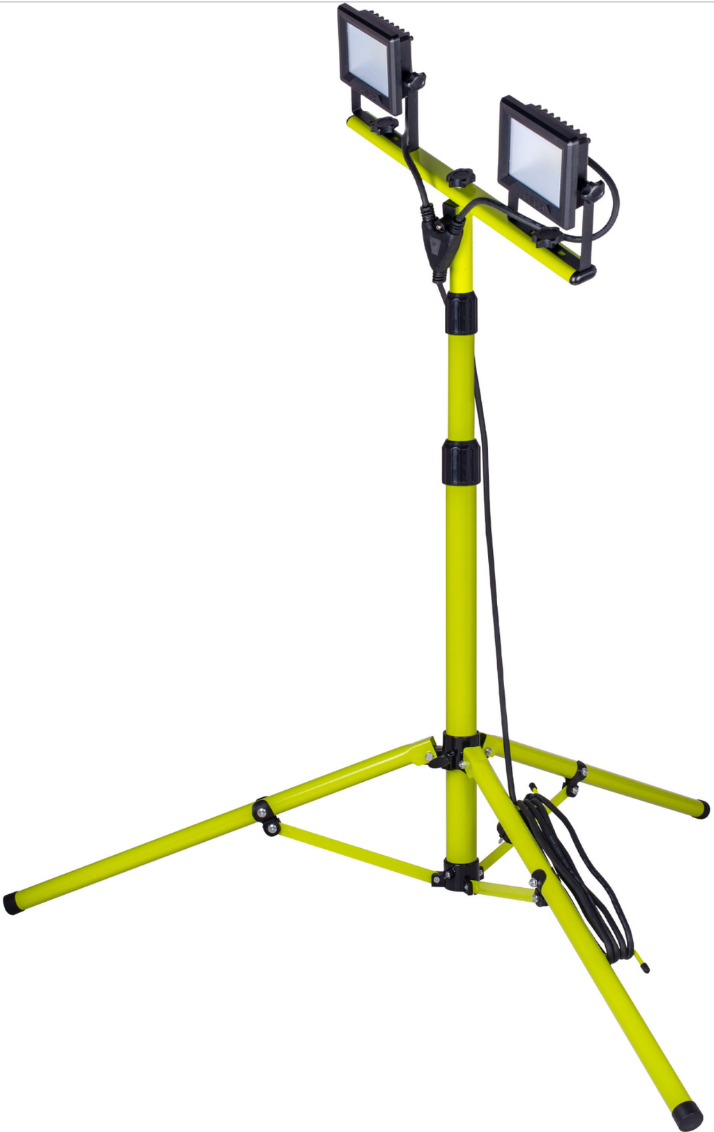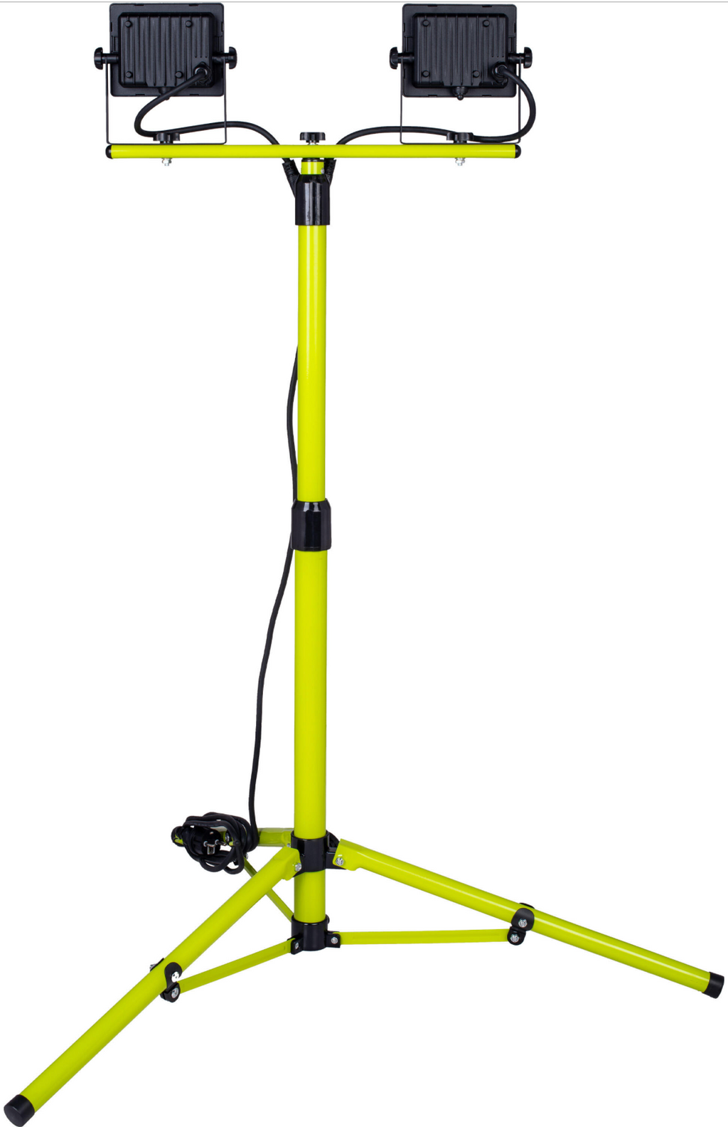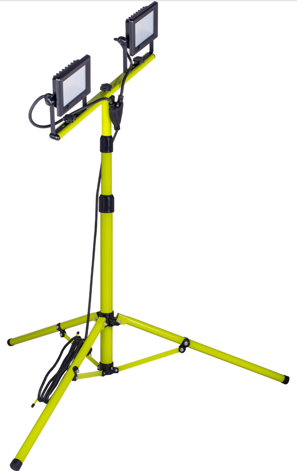 Portable LED floodlight with two 20 W lights, delivering a total of 3,200 lm in neutral light (5,000 K). Its lightweight and durable structure features an adjustable-height tripod and multi-position base, ideal for outdoor work. With IP65 protection, it is water- and dust-resistant, and comes with a 3-meter H05RN-F cable.