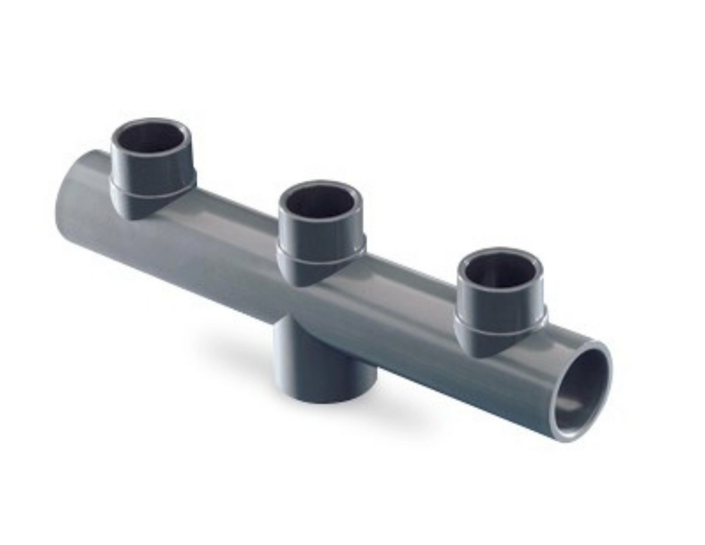 This robust PVC manifold (Colector/Manifold) with a 50 mm main connection and multiple outlets for pressure lines facilitates distribution in plumbing, irrigation, or pool systems. Made from durable PVC‑U and compatible with securely screwed pipes. The manifold allows clean, leak-free connections without glue when installed using proper press or cut fittings. Manufactured to CE standards in Europe – designed for ready-to-install applications.