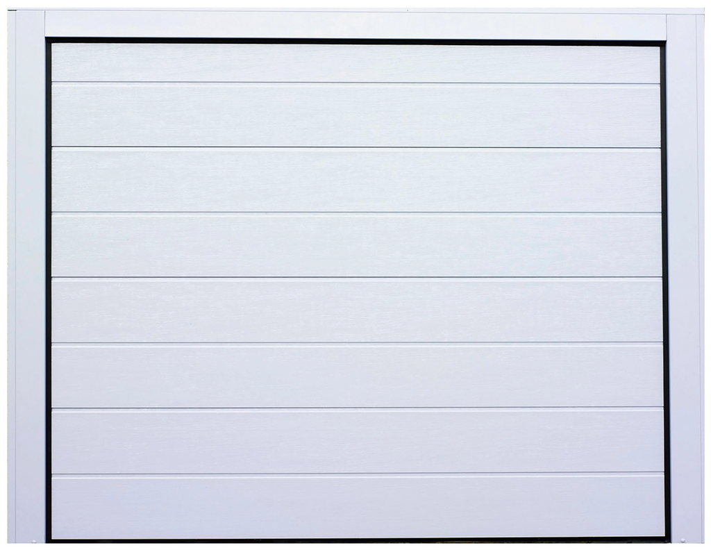 High-quality sectional door for garages with a white surface and thermal insulation provided by 20 mm thick sandwich panels.