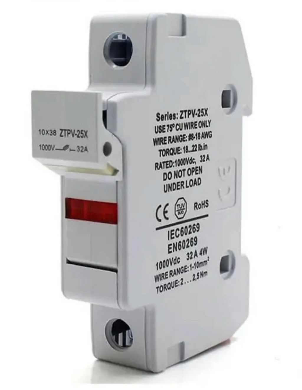 Material: Durable, self-extinguishing plastic with silver-plated copper contactsUse: Mounting of gPV fuses (10×38 mm) in PV system strings for overcurrent and short-circuit protection