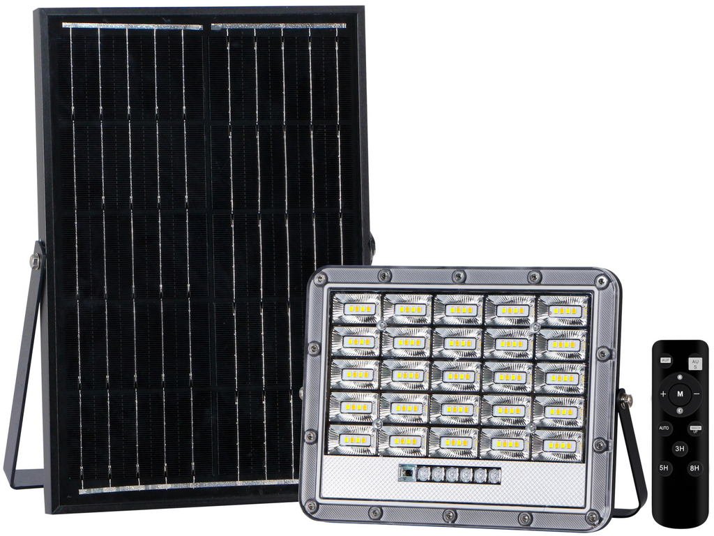 This solar floodlight with 100 W power offers selectable color temperatures (3,000 K, 4,000 K, 6,000 K) and features a remote control, motion sensor, and adjustable panel. Ideal for outdoor lighting of gardens, façades, pathways, or billboards.