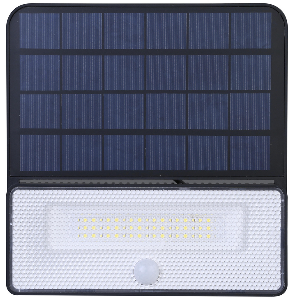 This solar floodlight with 12 W power and neutral white light (4,000 K) is particularly suitable for entrances, façades, or garden areas. It features a motion sensor and is adjustable up to 180°. With an IP54 protection rating, the device is weather-resistant.