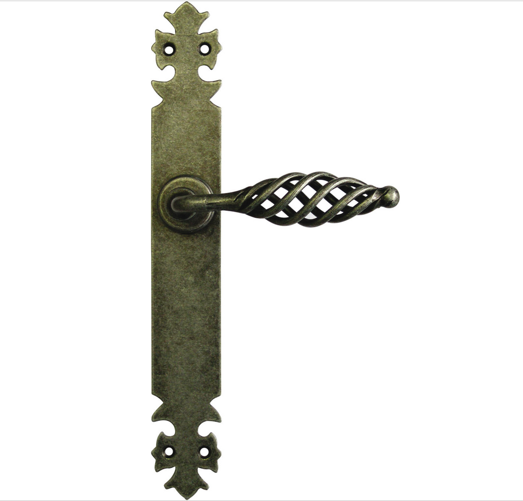 The Candela door handle set with black blank plate in wrought iron style gives interior doors a rustic and authentic look. The solid metal construction ensures durability and stability. With dimensions of approx. 26 × 5 × 6 cm, the set is suitable for doors without a locking function – ideal for living spaces, cabinet doors, or decorative doors. Made in Spain and suitable for wooden doors with standard thickness.
